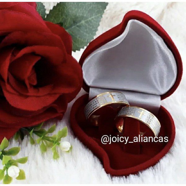 Par de alianças prata em aço cirúrgico 8mm Pai nosso dourado com prata. – Ideal para namoro, noivado e compromisso.