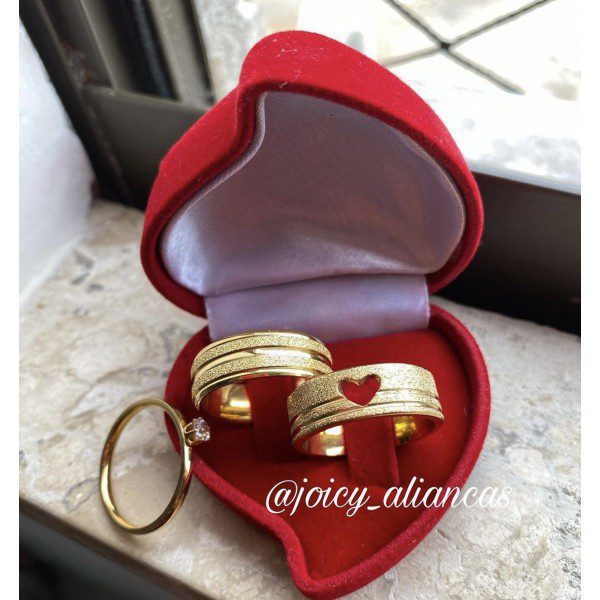 Trio De Alianças Aço Cirúrgico Banhado A Ouro 18k – 8mm – Diamantado Coração Fem