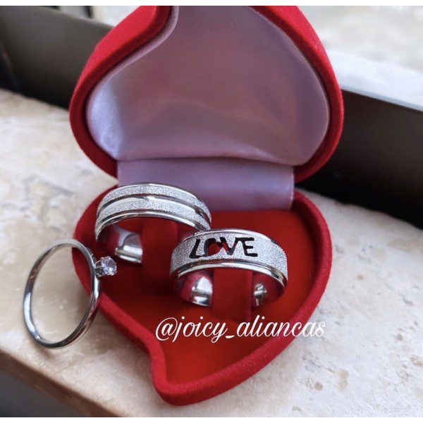 Trio de alianças prata em aço cirúrgico 8mm- LOVE diamantado. – Ideal para namoro, noivado e compromisso.